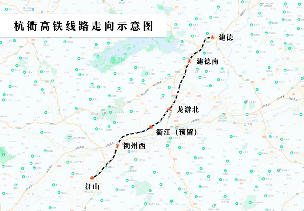 杭衢高铁位于浙江省建德市和衢州市境内,线路起自杭昌高铁黄昌段杨村桥线路所,途经杭州市所辖建德市,衢州市所辖龙游县、衢江区、柯城区、江山市,终至江山站杭衢场,正线全长约131公里,设计时速350公里,共设建德(既有)、建德南、龙游北、衢江(预留)、衢州西、江山(改扩建)6个车站,桥隧比达78.7%。